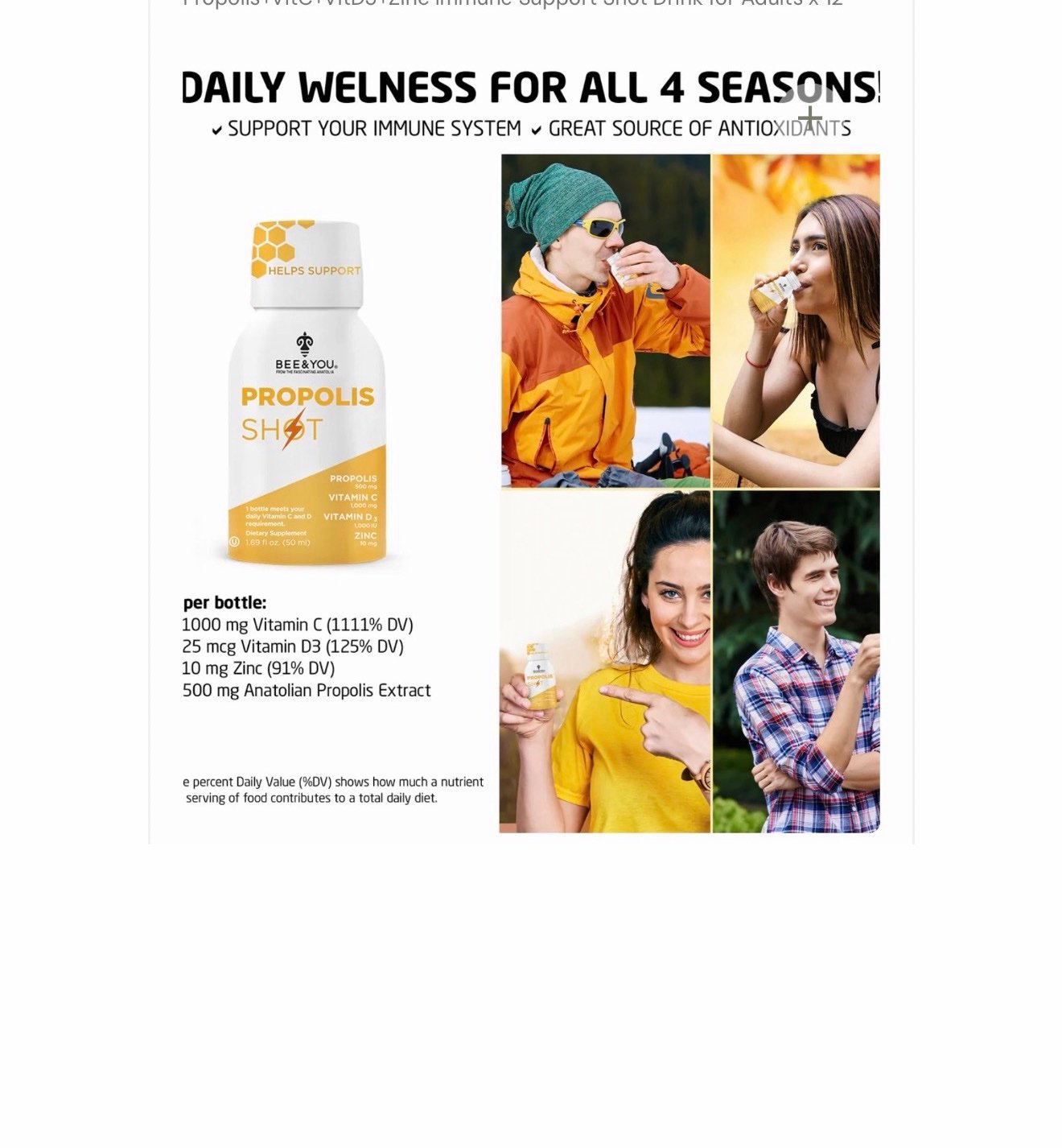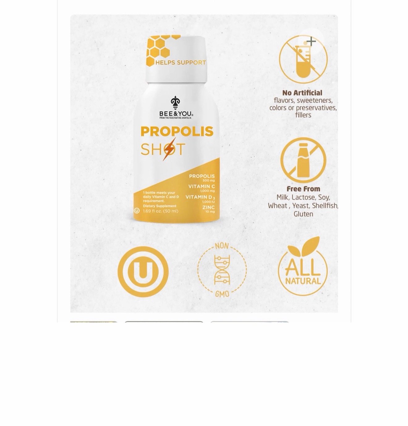 Propolis, Vitamin C, Vitamin D3 and mineral Zinc naturally supports immune system. Propolis is a natural bee product that honeybees collect from the leaves, buds, and stems of the plants. It acts as a natural protective barrier.